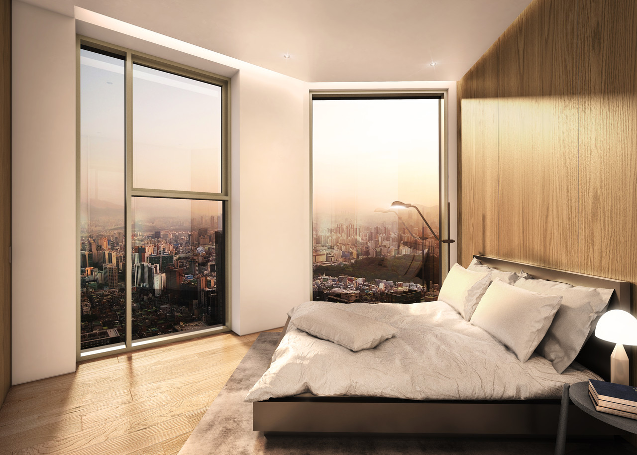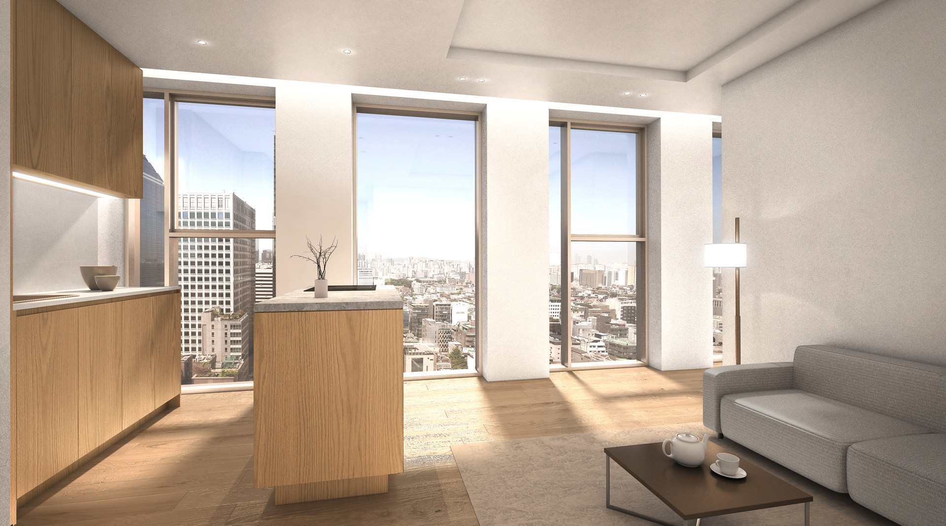 오블리크 타입은 건축적 사선 구조를 실내에 유기적으로 반영하여, 독창적인 시야와 입체적인 공간감을 연출합니다. 연속형 전면 창을 통해 도산대로의 풍경이 시원하게 펼쳐지며, 침실•클린존•LDK가 일렬로 구성되어 탁 트인 개방감을 극대화합니다. 외부와 연결된 테라스는 도시 위에 자리한 Private Urban Garden 처럼 기능하며, 일상 속에서 조망과 휴식을 동시에 누릴 수 있는 특별한 공간을 제공합니다.